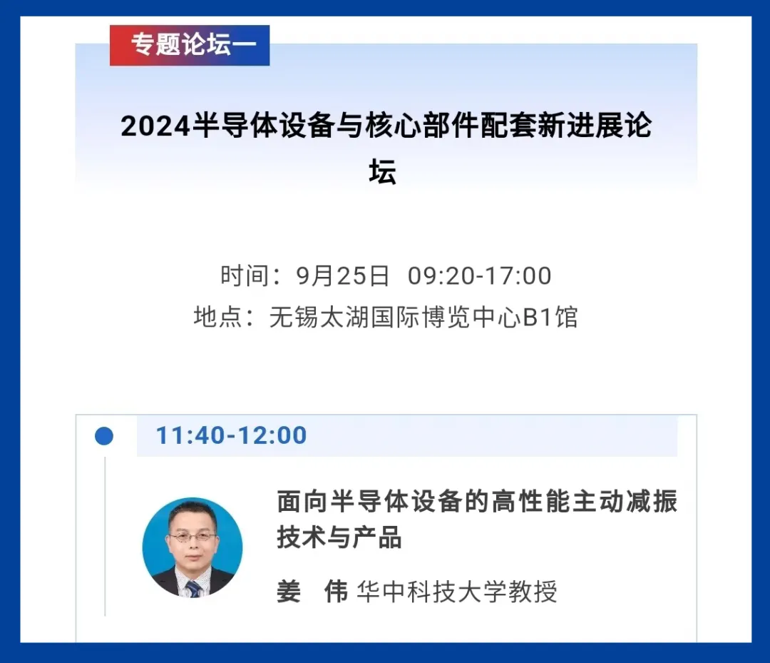同時(shí),華中科技大學(xué)教授、教育部“長(zhǎng)江學(xué)者”特聘教授兼格藍(lán)若技術(shù)顧問(wèn)姜偉將于2024年9月25日在B1館進(jìn)行關(guān)于“面向半導(dǎo)體設(shè)備的高性能主動(dòng)減振技術(shù)與產(chǎn)品”專(zhuān)題演講,為大家科普主動(dòng)減振技術(shù)最前沿的知識(shí)體系。